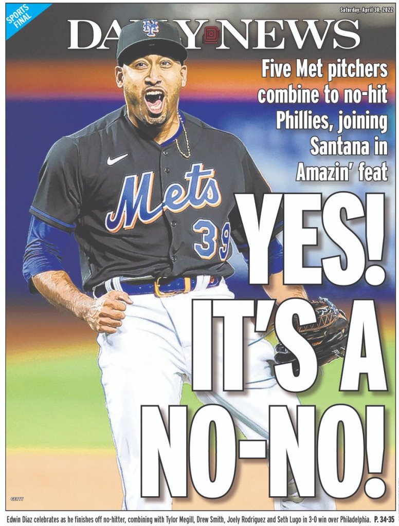 At Citi Field, five pitchers – Megill, Drew Smith, Joely Rodriguez, Seth Lugo and Edwin Diaz – combined to blank the Phils for MLB’s first no-hitter of the season, their 159 total pitches being the most ever thrown in a nine-inning no-hitter. And all on Gary Cohen’s birthday.