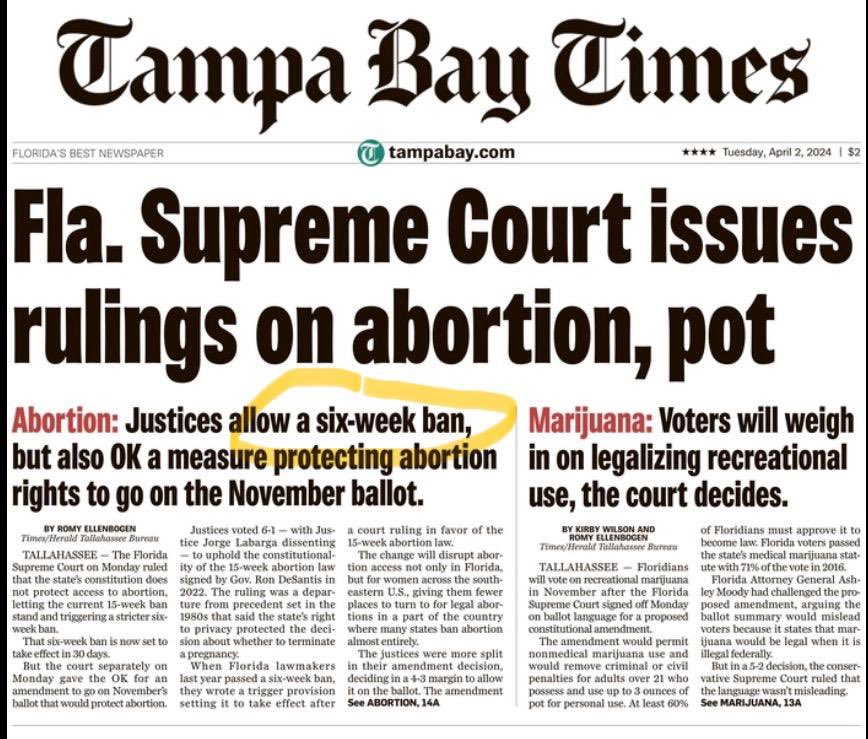 - The Florida Supreme Court ruled today that the state’s voters should decide whether to protect abortion rights, allowing a six-week ban to stand but rejecting the state attorney general’s arguments that the measure should be kept off the November ballot.
