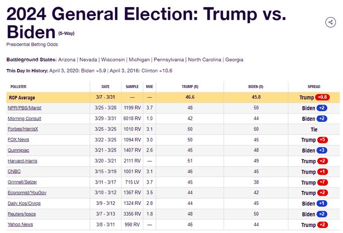 Meanwhile, the March Jobs Report agains blew through expectations, showing 303,000 jobs created in the month and unemployment dropping to 3.8 per cent. The challenge for the Biden campaign remains translating strong data into how potential voters feel about how the economy interacts with their individual lives.