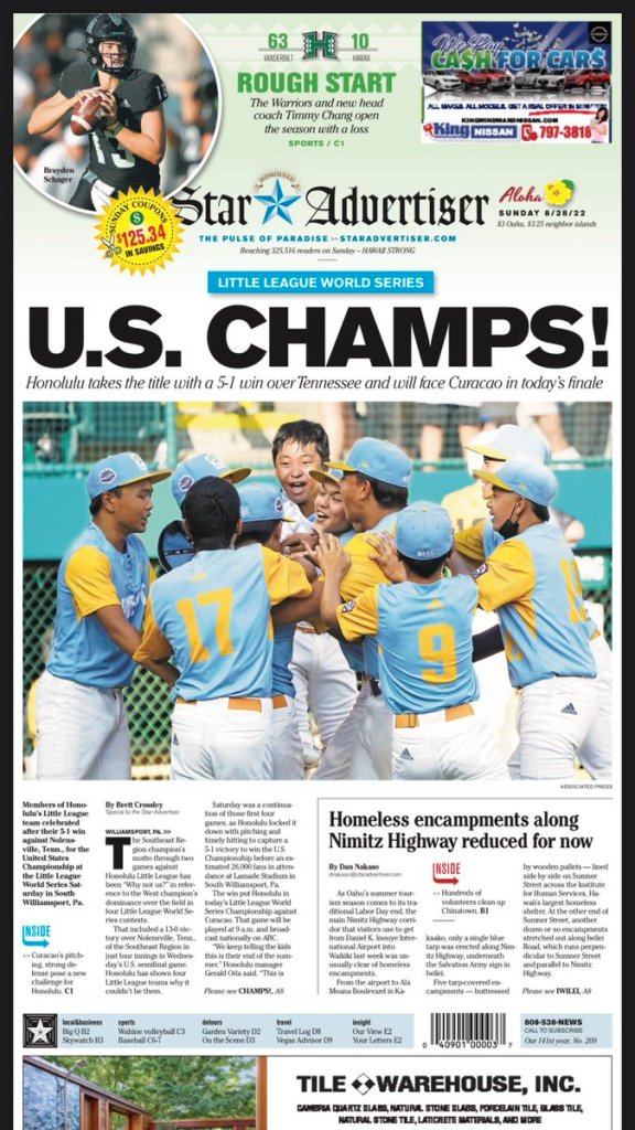 Congratulations to the Hawaii kids who won the Little League World Series yesterday, beating Curacao 13-3. In six games, all of which they won, Hawaii outscored opponents 60-5. The closest margin was four runs. It’s Hawaii’s fourth LL title.