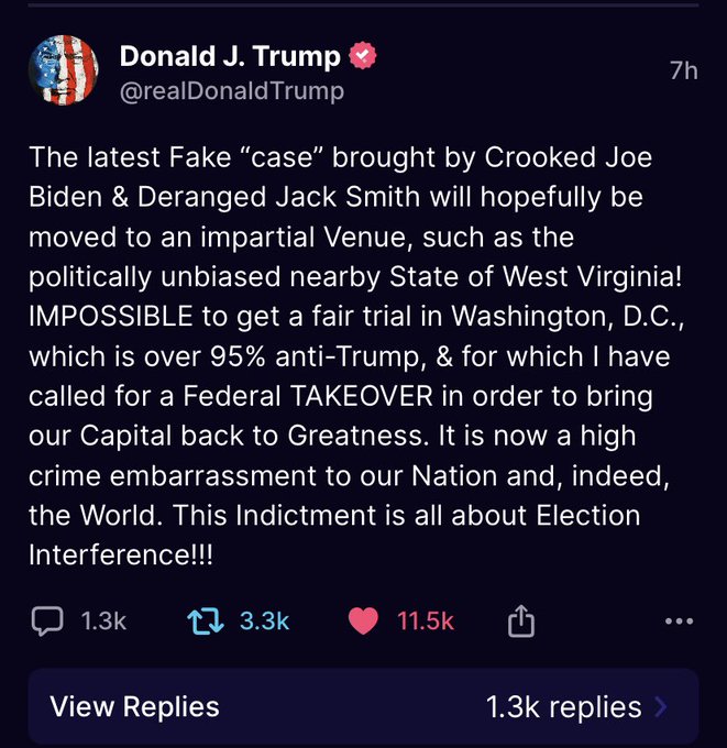 Earlier: Ahead of his arraignment this afternoon for allegedly inciting – at least – a public disturbance on the streets of Washington DC, the former President appeared to – at least – hint at inciting another. Oh, and he wants the trial moved to West Virginia, where the alleged offenses didn’t take place, but where he won by about 40 points.