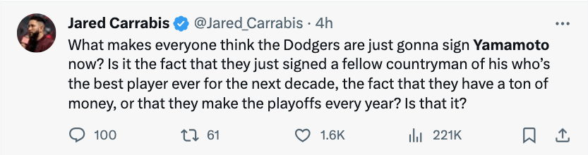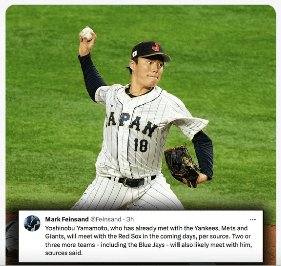 - After the Ohtani circus, attention turns to Yoshinobu Yamamoto, apparently – unsurprisingly – being aggressively pursued by the Dodgers and their newly-flexible salary pool. Other teams seem to be in the hunt too.