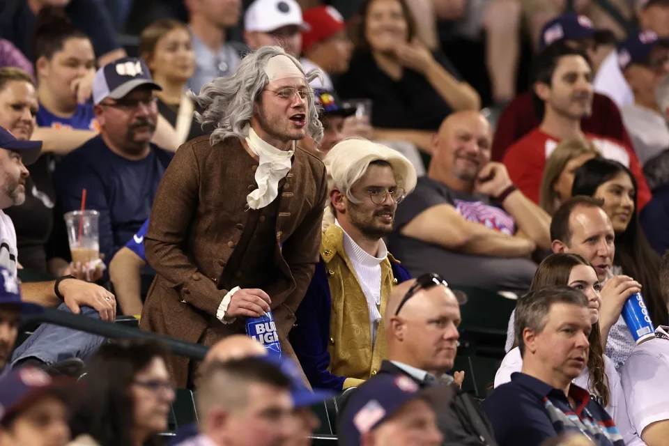 The shot may not have been heard around the world, but it at least temporarily silenced a crowd that had come expecting a slugfest on the other side of the scorecard. The crowd had also come to perform themselves, with a gathering of costumed minutemen, bald-bewigged Ben Franklins and almost as many tricorn hats as $49 USA baseball caps.