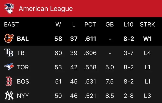 The O’s have scored double-digit runs in 4 of their last 5 games and, because of the restructured schedules this year, became the first American team to beat every other team at least once in a single season.