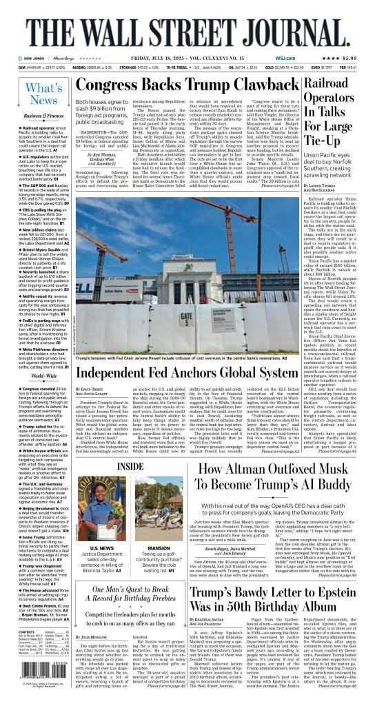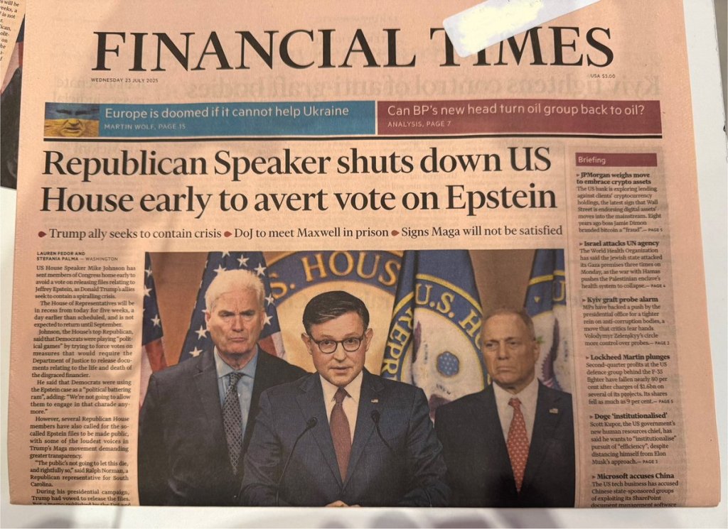 “Cult loyalty is blind, until it isn’t…” Ed Luce writes at the FT on Trump’s first real difficulty subduing a restive and angry base – over the Jeffrey Epstein story, which doesn’t loook like it will be going away anytime soon.