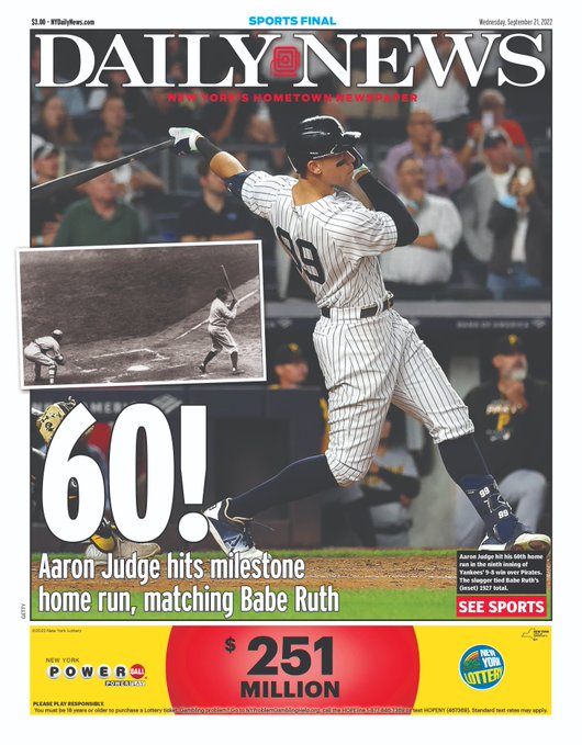 Aaron Judge’s pursuit of Roger Maris’s HR record* heads to Toronto after a rain-shortened game in the Bronx Sunday night. While ESPN are still happy to cut to him and force everyone to watch every at-bat, you get the feeling no-one wants this thing to be over more than the copy editors at the New York Post, who you suspect have now officially exhausted their supply of legal puns.
